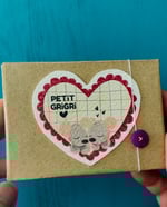La boîte de 10x7 cm est décorée d’un cœur en simili cuir et d’une petite broderie.