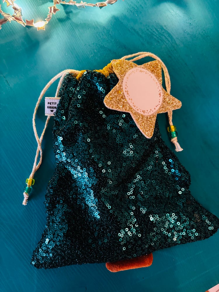 Joli pochon cadeau en forme de sapin En Nicky velours doublé de coton liberty assorti. Lien coulissant fermé par une étoile. Elements realisés au crochet.